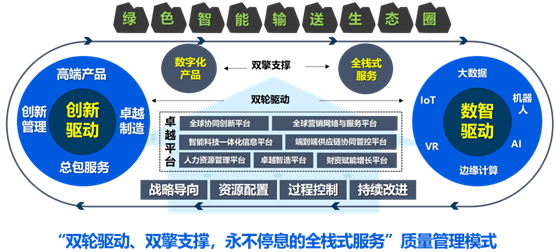 它以 “数字化产品”与“全栈式服务”为两大支撑引擎,直接服务于绿色智能输送生态圈的构建;以 “创新驱动”与“数智驱动”为核心双轮,为产品与服务注入持续领先的差异化优势与高可靠保障;并以追求“高可靠、零缺陷”的卓越绩效为基石,依托 “七位一体” 的组织平台确保战略高效落地与持续进化。这一模式不仅具备前瞻性与系统性,更具突出的可复制性与有效性,已在多家子公司及合作项目中成功实践,助力公司实现从战略到运营的全方位质量引领,成为驱动公司可持续经营与行业进步的核心框架。此次获奖,正是对这套以“经营质量”为最终标尺的系统性管理模式的权威认可。