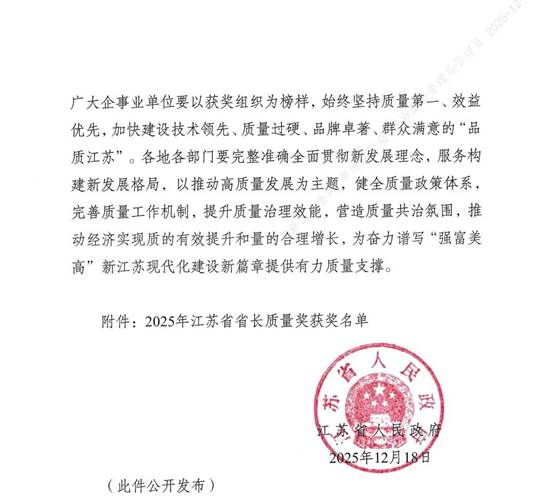 近日,2025年度江苏省省长质量奖获奖名单正式揭晓。宝通凭借卓越的经营质量、系统性的创新驱动及显著的综合绩效,成功摘得这一全省质量领域的最高荣誉。该奖项不仅是对宝通长期秉持高质量发展理念、构建卓越运营体系的权威认可,更标志着公司实现了从“质量优势”到“全面经营领先性”的标杆跨越。尤为值得瞩目的是,宝通是2025年度无锡市唯一获此殊荣的企业,这一成就不仅是对企业自身质量管理卓越水准的最高褒奖,也为“无锡制造”树立了鲜明的高质量发展新标杆。